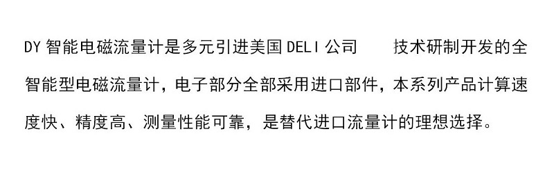 DY智能電磁流量計是流儀引進美國DELI公司技術研制開發(fā)的全智能型電磁流量計,電子部分全部采用進口部件,本系列產品計算速度快、精度高、測量性能可靠,是替代進口流量計的理想選擇。