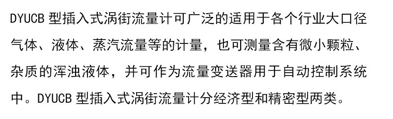 DYUCB型插入式渦街流量計(jì)可廣泛的適用于各個(gè)行業(yè)大口徑氣體、液體、蒸汽流量等的計(jì)量,也可測(cè)量含有微小顆粒、雜質(zhì)的渾濁液體,分經(jīng)濟(jì)型和精密型兩類。